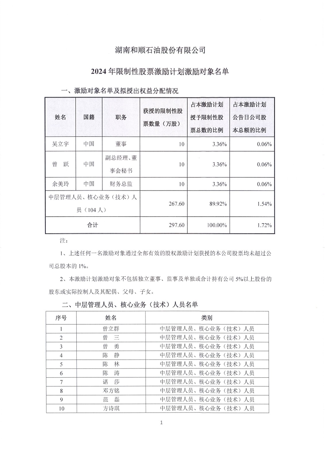 湖南和順石油股份有限公司(以下簡(jiǎn)稱“公司”)于2024年4月25日召開(kāi)第三屆董事會(huì)第九次會(huì)議和第三屆監(jiān)事會(huì)第八次會(huì)議,審議并通過(guò)《關(guān)于公司<2024年限制性股票激勵(lì)計(jì)劃(草案)>及摘要的議案》等相關(guān)議案。根據(jù)中國(guó)證券監(jiān)督管理委員會(huì)《上市公司股權(quán)激勵(lì)管理辦法》的有關(guān)規(guī)定,公司對(duì)2024年限制性股票激勵(lì)計(jì)劃激勵(lì)對(duì)象的姓名和職務(wù)進(jìn)行如下公示,公示期為2024年4月30日至2024年5月9日,共10天。在公示期間,對(duì)公示對(duì)象有異議的,可經(jīng)書面郵件形式向公司監(jiān)事會(huì)反映,接收郵箱為:pengmujun@hnhsjt.com。